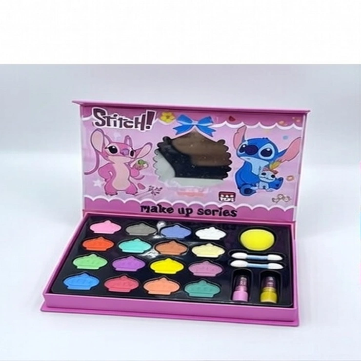 Стильный набор детской косметики с изображением Стича из диснеевского мультфильма. В коробке: 18 оттенков теней, аппликаторы, губная помада и блеск. Все средства легко смываются водой, безопасны для детской кожи. Яркие цвета и компактная упаковка идеальны для домашних игр, детских праздников и творческих экспериментов. Подарочная коробка с магнитным замком сохраняет порядок. Отличный подарок для девочек от 3 лет. Развивает воображение и чувство стиля. Материал: пластик, картон. Размер: 15×15 см.